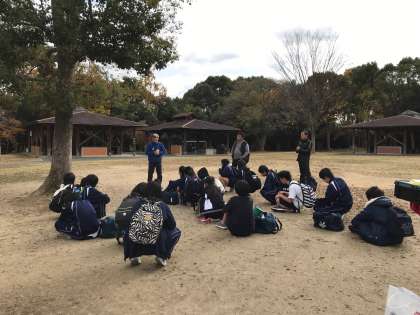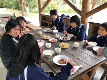 7年生は、信太山で野外炊飯をしました。各班に分かれ、まきを使って、ハンバーグ、チャーハン、焼きそば、豚汁、コーンスープなど、協力して作りました。寒い1日だったので、体も暖まりおいしくいただきました。