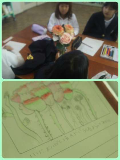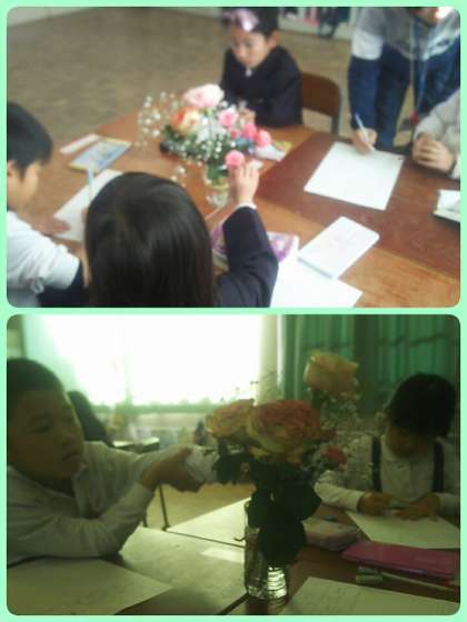 1年生は、図工でバラの花を描きました。花びらから茎まで、丁寧に線を書いてから、ピンク、オレンジ、赤などよく見て色もぬりました。実際にバラの花も、現在1年生の教室に飾ってあります。