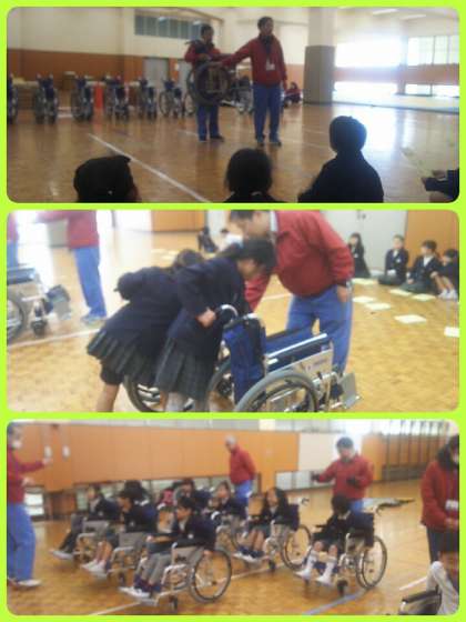 3年生は、車いす体験学習にのぞみました。はじめに、車いすの基本的な操作を学習したあと、段差やスロープに気をつけて自走体験をしました。次は外に出て、友達を乗せて押す介助体験をしました。仮想段差も声をかけながら、優しく押すことができました。