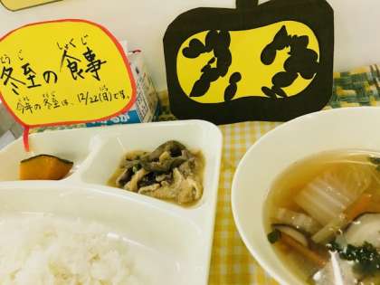今日の献立は「豚肉と干しずいきのみそ煮、すまし汁、焼きかぼちゃ、ごはん、牛乳」でした。今年の冬至は12月22日です。