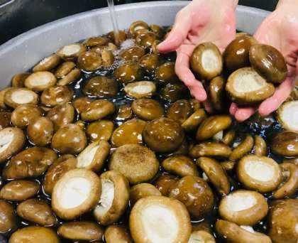 (下)すまし汁に入る「生しいたけ」です。しいたけには、ビタミンDが多く含まれます。骨や歯を丈夫にしたり、カルシウムの吸収率を高めたりといった効果があります。