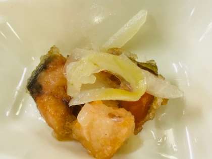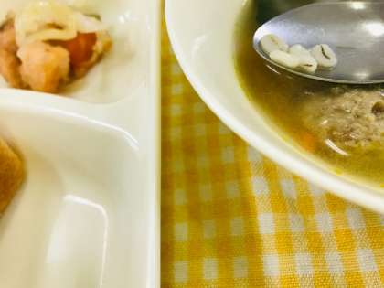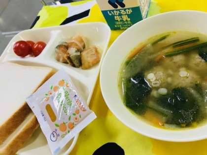 12/18の給食は「さけのマリネ、肉だんごと麦のスープ、プチトマト、食パン、アプリコットジャム、牛乳」でした。「さけのマリネ」は塩、こしょうで下味をつけ、でん粉をまぶして、カリッと揚げたさけにマリネソースをかけていただきました。さけの皮までおいしく食べることができました。