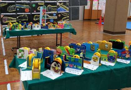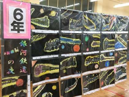 文化祭の展示発表での6年生の作品は、平面作品『銀河鉄道の夜』と立体作品『お気に入りのテープカッター』です。どちらの作品も夢を感じる出来上がりです。