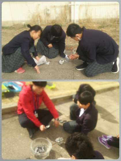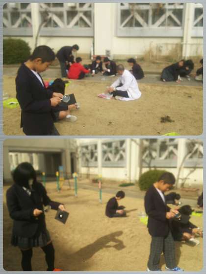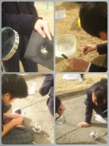 7年生の理科では、凸レンズにどのような性質があるのか学習しています。この日は、光の進み方を考えて、光を1点に集めた時にはどうなるかを実験で調べました。太陽の光をうまく集めながら、注意点も意識して真剣に実験していました。