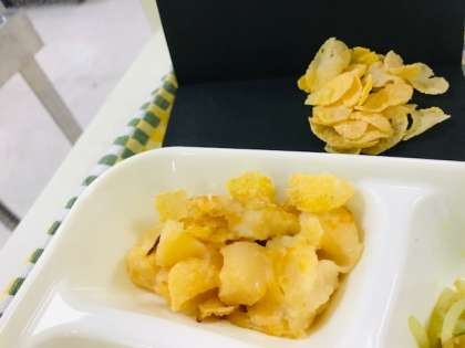 ミニバットにコーンフレークを敷き、卵、クリーム、砂糖、小麦粉、白桃を混ぜ合わせた生地を流し入れ、焼き上げます。