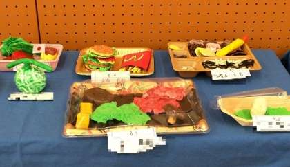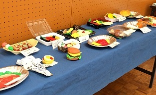 文化祭作品展示、毎年、美術科の授業で作成した作品の数々が彩りを加えてくれます。写真の「食品サンプル」は注目の的です。