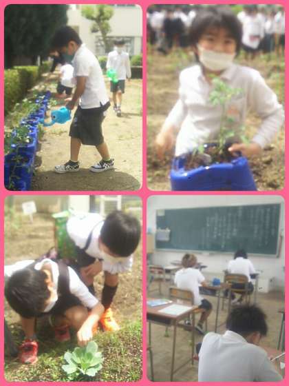 2年生は、図書室で本を読んだあと、ミニトマトの苗を植えました。たくさん実ができるといいですね。
