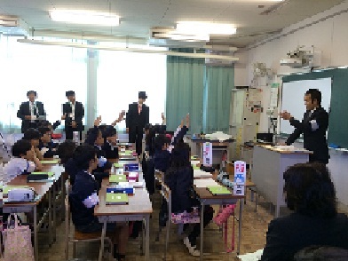 課題「『もずやん』を大阪府に定着させる方法を、タブレット新聞のコラムにまとめよう」をたて、Skype(通信機能)で熊本の小学生に「くまモン」に関する質問をして、どのように知名度をあげていったかを探りました。班で、「もずやん」を定着させる方法を考え、タブレット新聞のコラムに書き、最後に、完成したコラムを班ごとに発表しました。