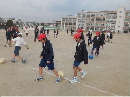 今回は、5・6年生対象の夢授業です。ボールをドリブルしながらペアの友だちの後ろについて歩きます。ボールばかり見ていると、前の子が急に曲がるとついていけません。ボールを見ながら、前の子も見ながらみんな楽しんで取り組んでいました。