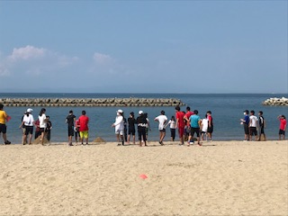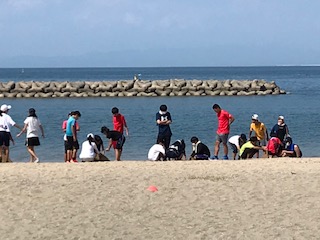 砂積み競争です。砂を多く積んだチームの勝ちです。