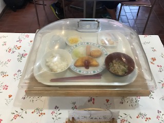 朝ごはんです。メニューは、ご飯、オムレツ、チキンナゲット、ウインナー、ポテト、キャベツ、たくあん、味噌汁でした。美味しくいただきました。