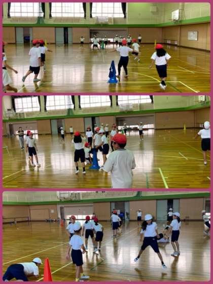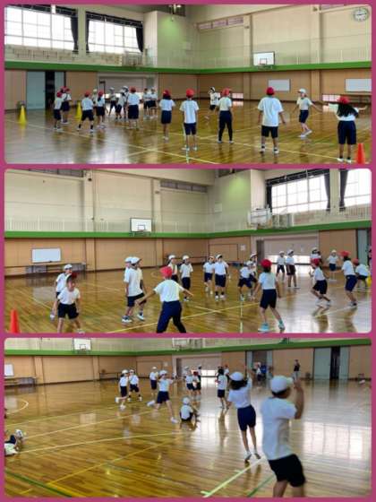 4年生は、ポートボールの学習があります。それに向けて、相手をかわしながら敵の陣地に入ったり、自分の陣地を守ったりする練習をしています。作戦も工夫して考えています。意表をつく攻撃も見られ、上達してきました。実際に、ボールを持ってポートボールをしていくのが楽しみですね。