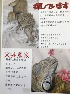 昨日、午後4時30分ごろ、グリーンイグアナが逃走しました。胴体は60cm、しっぽは約1mで全身緑色です。草食で普段は温厚ですが、外敵とみなすと噛みついたり、しっぽを打ち付けたりしてきます。発見しても近づかず、すぐに警察に通報してください。子ども達には、各学級で指導しています。
