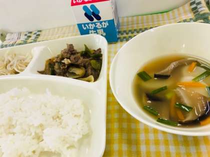 今日の献立は「プルコギ、トック、もやしの甘酢あえ、ごはん、牛乳」でした。韓国・朝鮮の食文化を伝える献立として、「プルコギ」「トック」を組み合わせています。