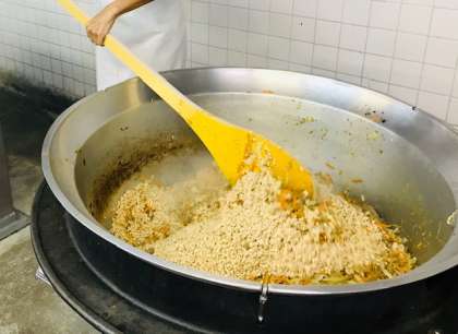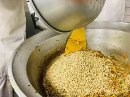 (上・中)ひきわり大豆を加えていためています。