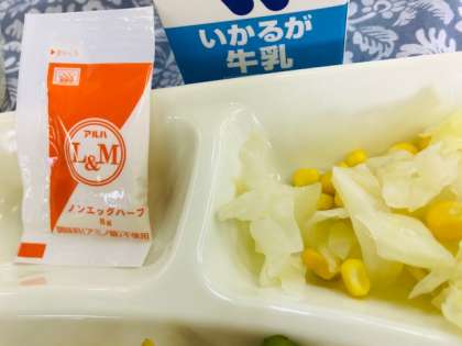 今日の献立は「大豆入りキーマカレーライス[米粉]、キャベツとコーンのサラダ[ノンエッグドレッシング]、白桃(カット缶)」でした。