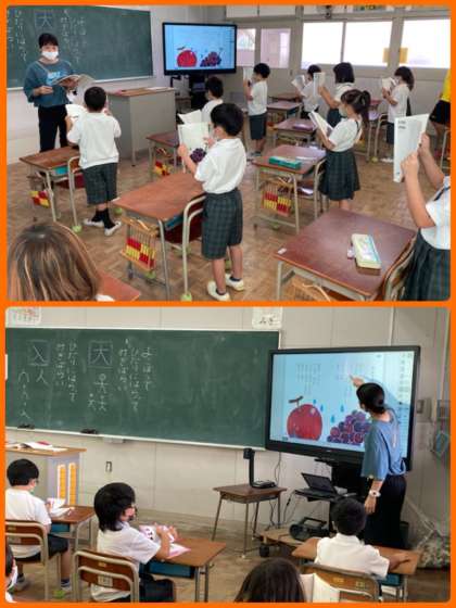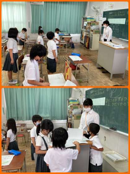 先週まで、1年生のクラスに教育実習生が来ていました。国語や算数など、たくさんの教科を教えてもらいました。休み時間はいっしょに遊んで、1年生みんながとても楽しそうな様子でした。