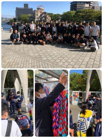 原爆ドーム前で平和を祈願しましました。その後、平和のメッセージと千羽鶴を捧げました。