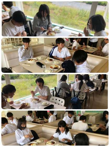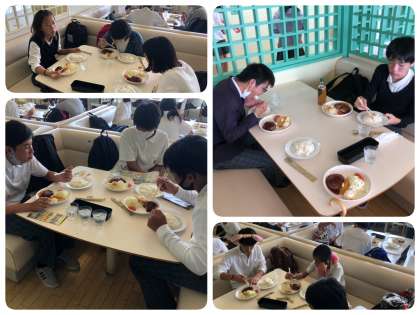 昼食タイムです。乗り物に乗った感想や次の作戦を考えてウキウキしています。