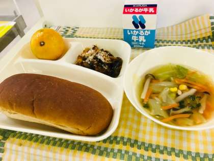 今日の献立は「なすのミートグラタン、鶏肉と野菜のスープ、みかん、黒糖パン、牛乳」でした。