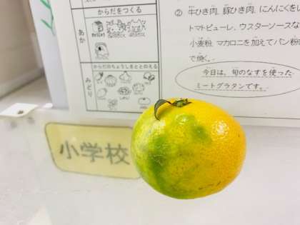 (中)給食調理員さんが、葉付きのみかんを1つかざってくれました。子どもたちからは「かわいい。葉っぱついてる。」「きのう、家でもみかん食べたよ。」「いいにおい」「これ、本物?」といった声がありました。