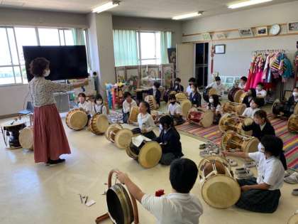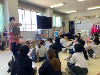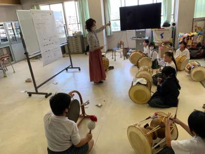 4年生は、ソンセンニムにチョソンの楽器について教えてもらいました。音の特徴や使い方を学んだあと、4種類の楽器を使って「サムルノリ」の演奏をしました。チョソン友の会で学んでいることの理解にもつながり、貴重な体験ができたと思います。