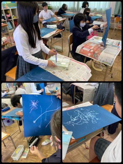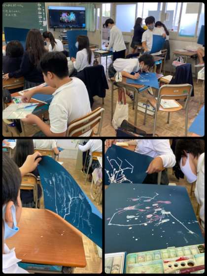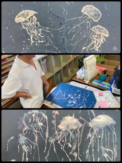 5年生は図工で、海に潜むクラゲを、絵の具の彩色方法を工夫しながら描きました。頭や口腕部分の細かな線も、画用紙を傾けたり、風を送ったりして、少しずつ完成に近づけていきました。まるで本物のようなクラゲが、何匹もできあがりました。