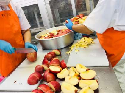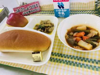 今日の給食は「豚肉のカレー風味焼き、ケチャップ煮、りんご、コッペパン、バター、牛乳」でした。青森県からおいしそうなりんごが届いていました。