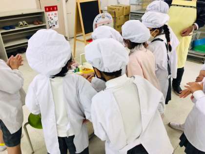 給食を取りに来た児童の様子です。2年生は先生からの問題がでていたようで、サンプルケースをいつも以上に一生懸命のぞき込んで答えを探す姿がみられました。