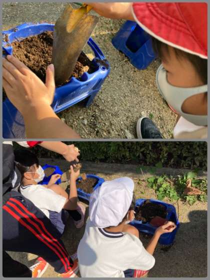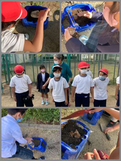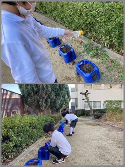 2年生は、自分の鉢に、スイセンの球根を植えました。少しだけ球根が見えるように、土を少しずつかぶせていき、水やりもしっかりしました。春に色鮮やかな花が咲くのを、心待ちにしながら水やりを続けていきましょう。