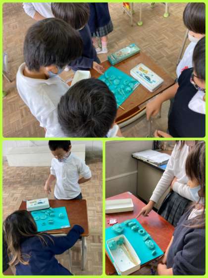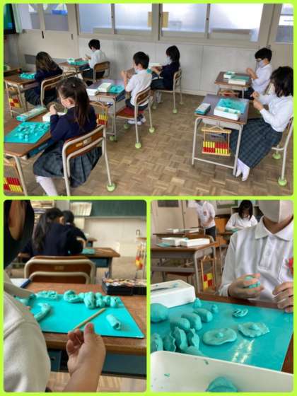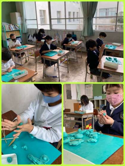 1年生は粘土で、オリジナルの給食メニューを作りました。主食にはステーキやたこ焼き、デザートにはケーキやみたらし団子を作った子もいました。おいしそうなメニューがずらりと並び、みんなの作品を見て、工夫点を伝え合いました。みんなが考えたメニューが給食に並ぶ日が、来てくれるかな?