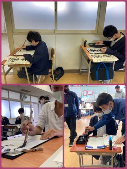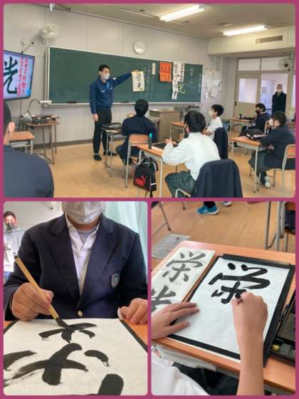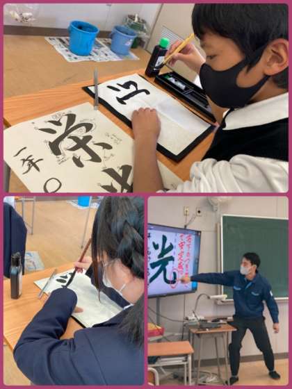7年生の国語で、書写をしました。行書の特徴を生かして「栄光」の二字を書きました。前回の授業で書いた自分の作品をふり返りながら、注意点を視覚的に伝えて目標を焦点化していきました。点画の連続と筆使いを意識しながら、集中して書くことができました。今後も、様々な技法を習得していけるといいですね。