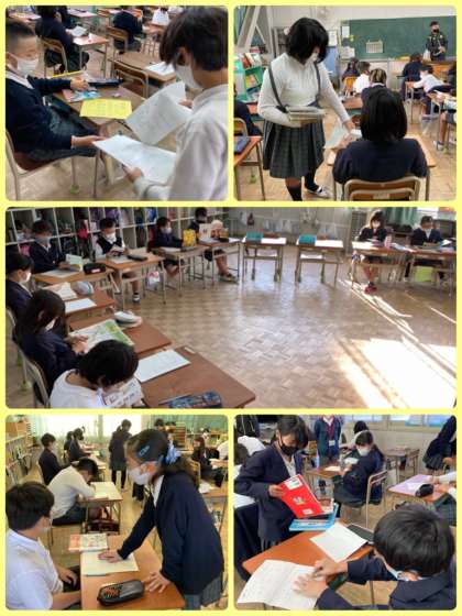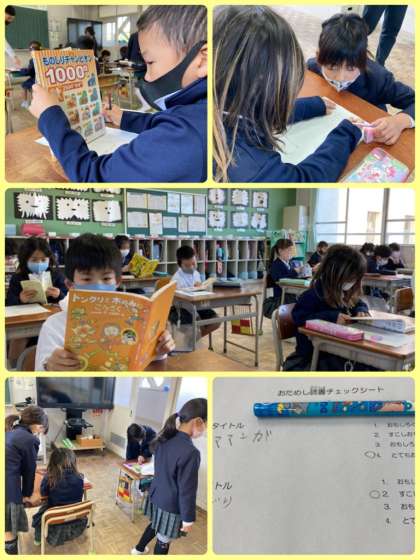 図書委員会の児童が各クラスに行き、「おためし読書」の取り組みをしました。「おためし読書」とは、1冊につき数分間読むことを数回繰り返し、そのたびにシートに興味度チェックを記入していく読書啓発運動です。ジャンルの違う複数の本を手にすることで、新たな分野に関心が広がることもあります。興味をもった本は、そのまま借りて続きを読むこともできます。