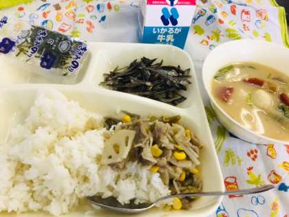 今日の献立は「れんこんのちらしずし、ぞう煮、ごまめ、牛乳」でした。