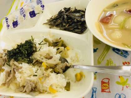 令和3年1月から 調理法に「米飯に具を混ぜ合わせる」工程がある献立は、配食時にご飯を盛りつけた上に具をかけ、喫食時に混ぜ合わせる。になりました。