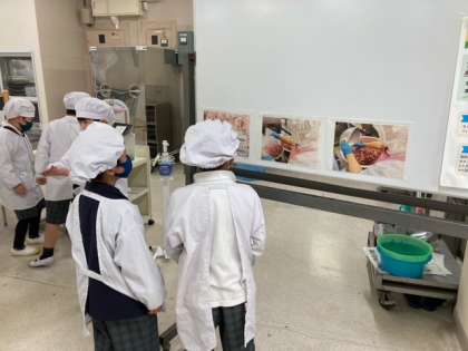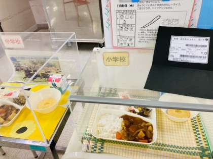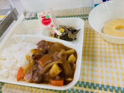 今日の給食は「牛肉と金時豆のカレーライス(近江牛)、ごぼうサラダ、パインアップル(缶)、牛乳」でした。「お肉がやわらかい。」「いつもおいしいけど、いつもよりおいしい。」といった感想がありました。