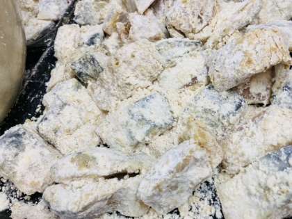 【さばのたつたあげ】しょうが汁、料理酒、こいくちしょうゆ、カレー粉で下味をつけ、でん粉をまぶしてなたね油であげました。ボウルのふたをあけるとカレーの香りがふわっと広がり、児童生徒に好評でした。