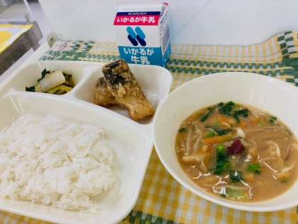 今日の献立は、学校給食献立コンクール優秀賞作品「さばのカレーたつたあげ、さつまいもとうすあげのみそ汁、はくさいとほうれんそうの煮びたし、ごはん、牛乳」でした。