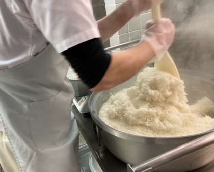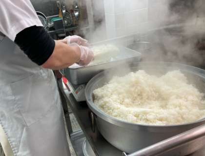 ごはんが炊き上がり、白いゆげがたちのぼります。学級ごとに重量を量り配缶します。ごはん、おみそ汁、さばのカレーたつたあげ…。あたたかいものをあたたかくいただけるしあわせ。今日も感謝をこめていただきました。