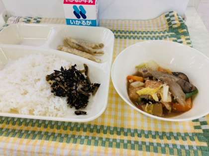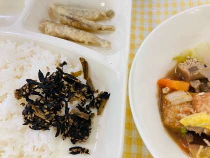 今日の献立は「いわしてんぷら、あつあげと野菜の煮もの、ごまひじき、ごはん、牛乳」でした。