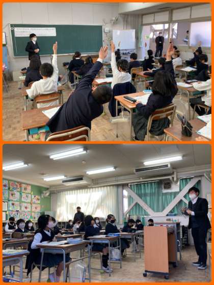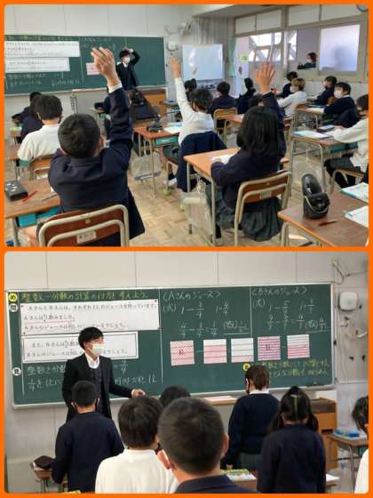 3年生は、分数の加法と減法の計算学習をしています。この日は、整数−分数の計算の仕方を考えました。見通しをもちながら、自力解決につなげていきました。ペアで交流しながら自分の考えを説明することで、深い学びを追求しました。