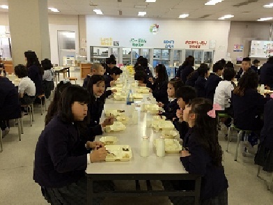「なかよし交流給食」では、違う学年の友だちだけでなく、給食調理員さん、管理作業員さん、事務職員さん、そして先生方が分かれて班に入ってくれています。いろいろなお話ができたでしょうか?