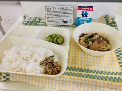 今日の献立は「すき焼き煮(近江牛)、きゅうりのゆずの香あえ、ツナっ葉いため、ごはん、牛乳」でした。今日は、大阪府国産農林水産物学校給食提供事業として近江牛が使われていました。