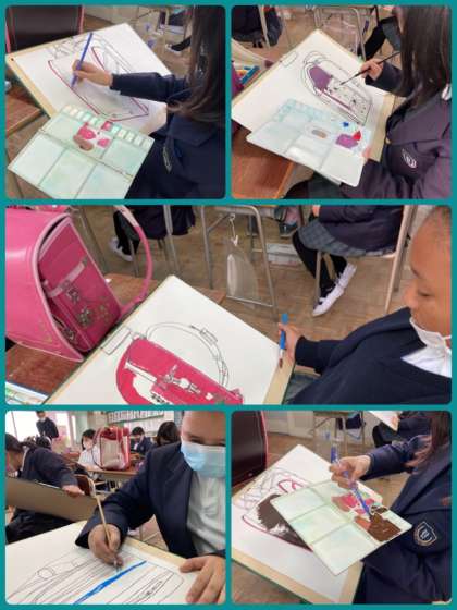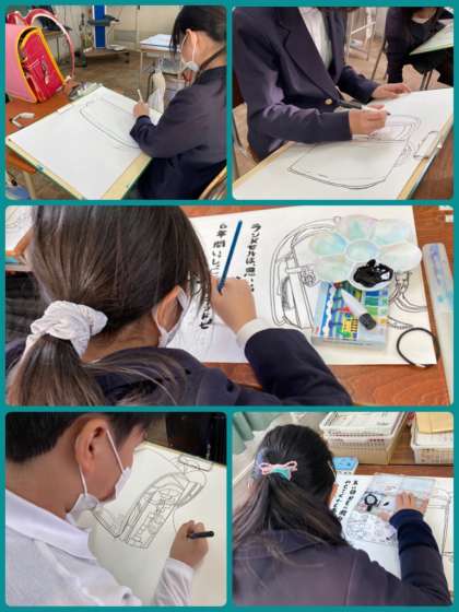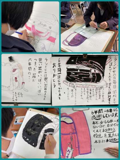 6年生は、図工でランドセルを描きました。6年間の思いも添えて、感謝の気持ちを表しました。彩色の仕方も、かすれや色あせを出せるように、細部まで丁寧に塗りこみました。