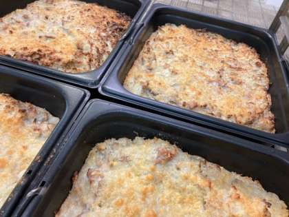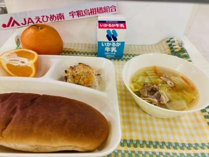 「押麦のグラタン、スープ、いよかん、黒糖パン、牛乳」でした。