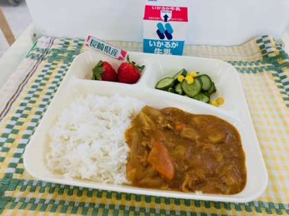 今日の給食は「ポークカレーライス、きゅうりとコーンのサラダ、いちご、牛乳」でした。いちごは、果物の中でも特にビタミンCを多く含んでいます。ビタミンCには傷の回復を早めたり、抵抗力を高めたりするなどの働きがあります。今日のいちごは長崎県産の【恋みのり】という品種でした。