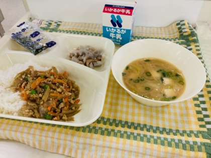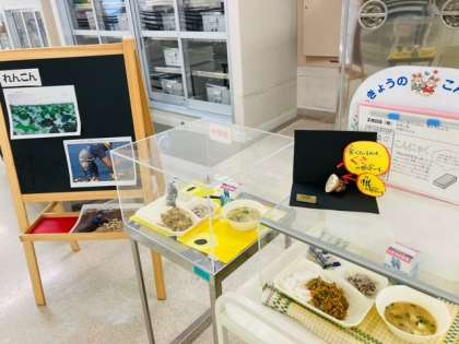 今日の献立は「鶏ごぼうご飯、みそ汁、焼きれんこん、牛乳」でした。節付きの立派なれんこんが徳島県から届いていました。れんこんを収穫するようすを掲示すると、熱心に見ている子どもの姿がありました。今日の【焼きれんこん】はいつも以上においしかったらしく、小学校、中学校ともに残食0でした。生産者の姿を知り感謝していただくことの大切さを感じました。