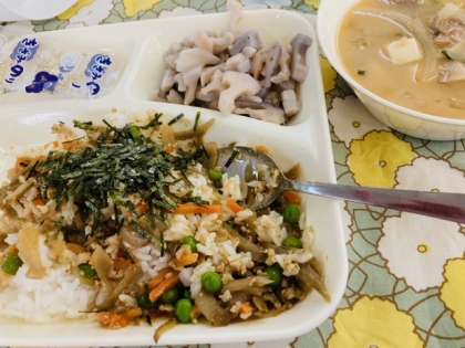 (下)鶏ごぼうご飯は、それぞれが上手に混ぜご飯にしていました。おかわりにもたくさん手があがっていました。
