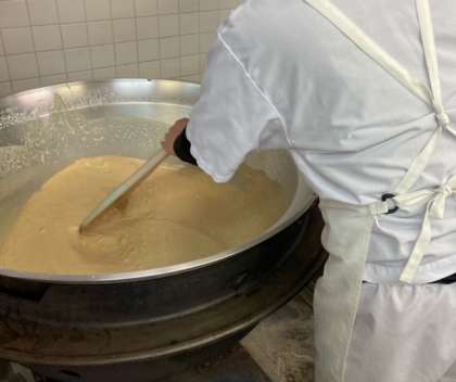 (上)小麦粉を丁寧にいためて、ルウをつくります。