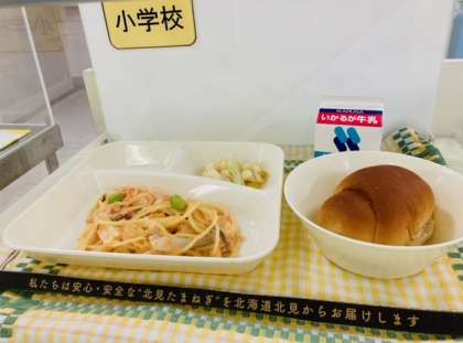 今日の献立は「さけのクリームスパゲッティ、カリフラワーとコーンのサラダ、1/2黒糖パン、牛乳、中:豆こんぶ」でした。さけのクリームスパゲッティに使われた玉ねぎは北海道から、カリフラワーは熊本県からと、今日もいろいろな都道府県から食材が届けられ、給食が作られていました。感謝のきもちをこめておいしくいただきました。